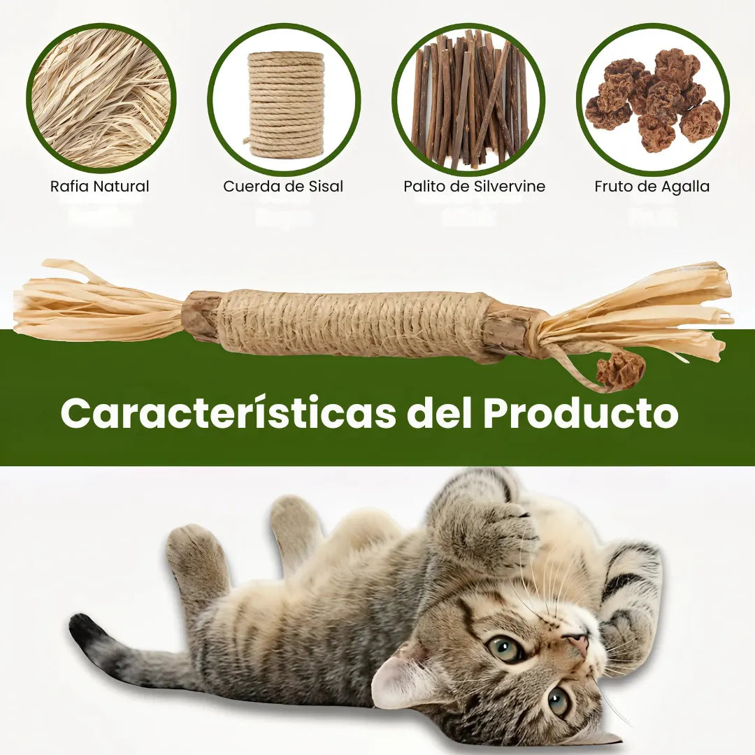 Cada palito incluye un fruto de gall, un premio muy querido por los gatos que proviene de la planta Silvervine.