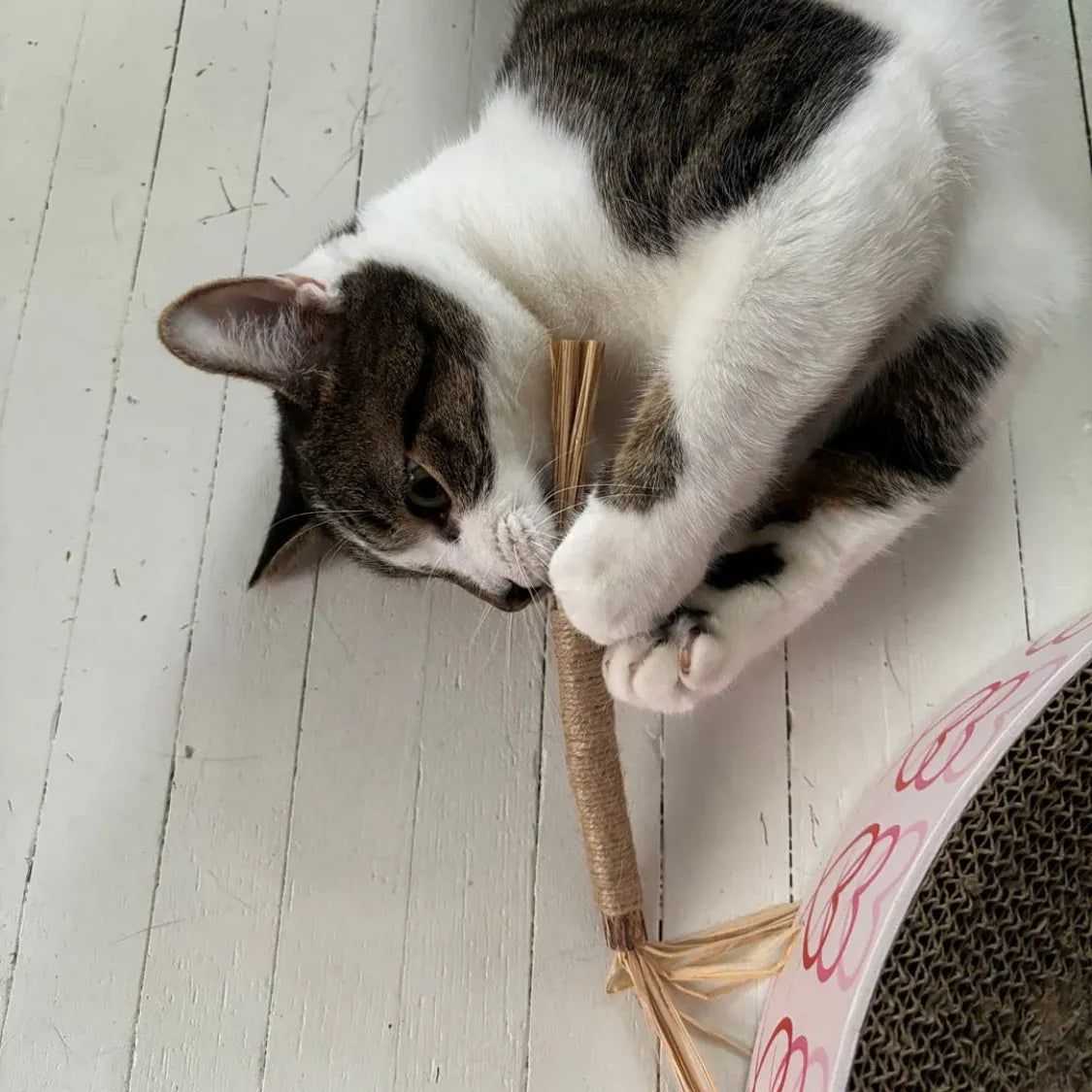 Para hacer el juego aún más entretenido, añadimos hojas secas de raffia, que crean un suave sonido crujiente que a los gatos les encanta.